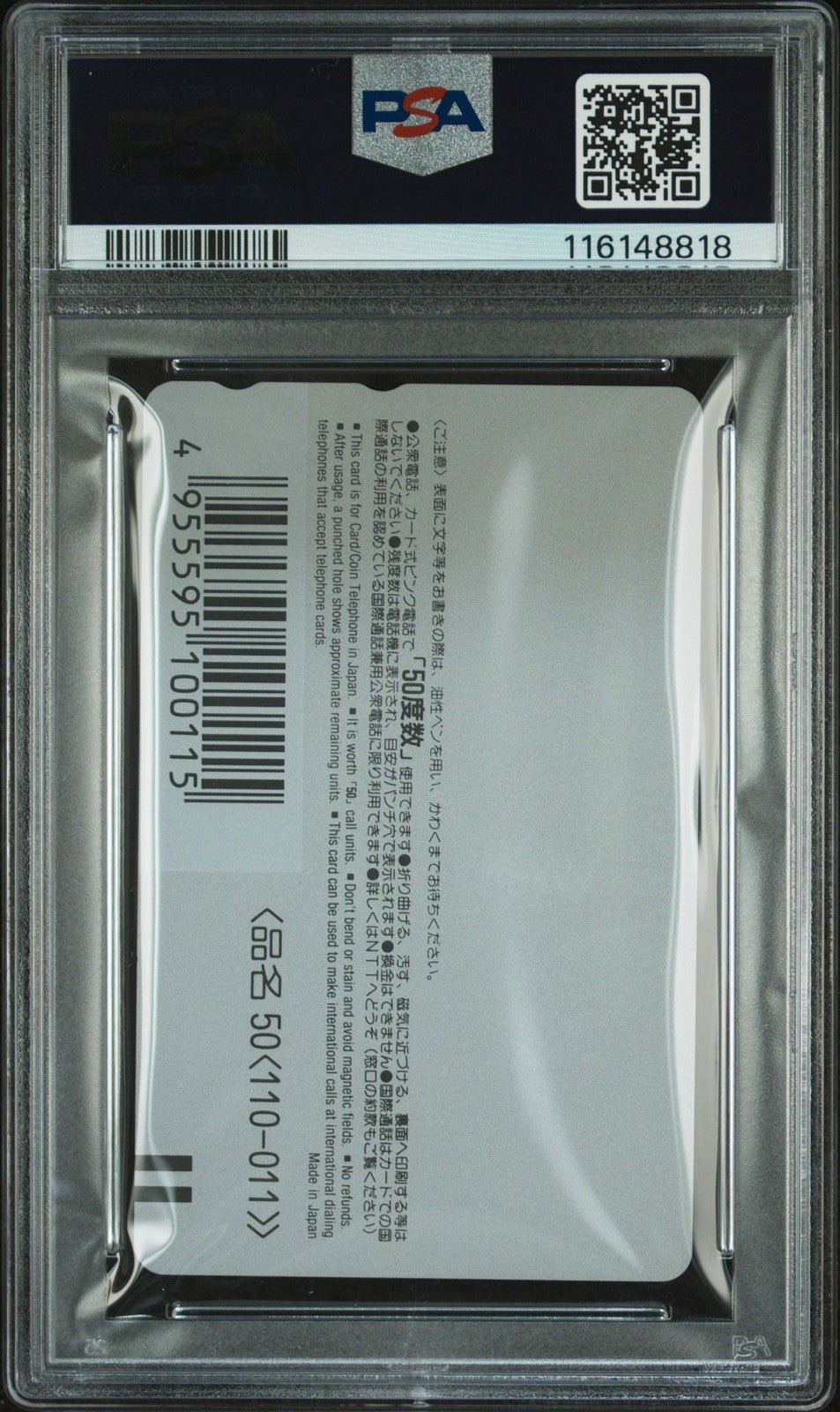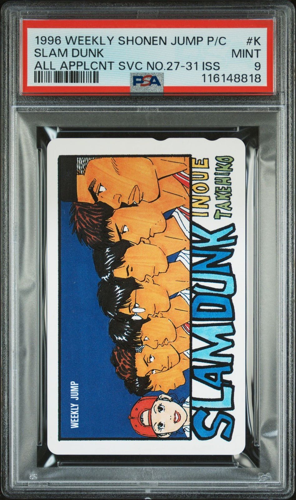 The product is a 1996 Weekly Shonen Jump phone card featuring the popular anime series "Slam Dunk." This collectible item has been professionally graded by PSA as a 9, indicating its overall condition and authenticity. It is a rare and sought-after item for fans of the franchise and collectors of non-sport trading cards. The phone card serves as a nostalgic piece of memorabilia from the anime era, making it a valuable addition to any collection.