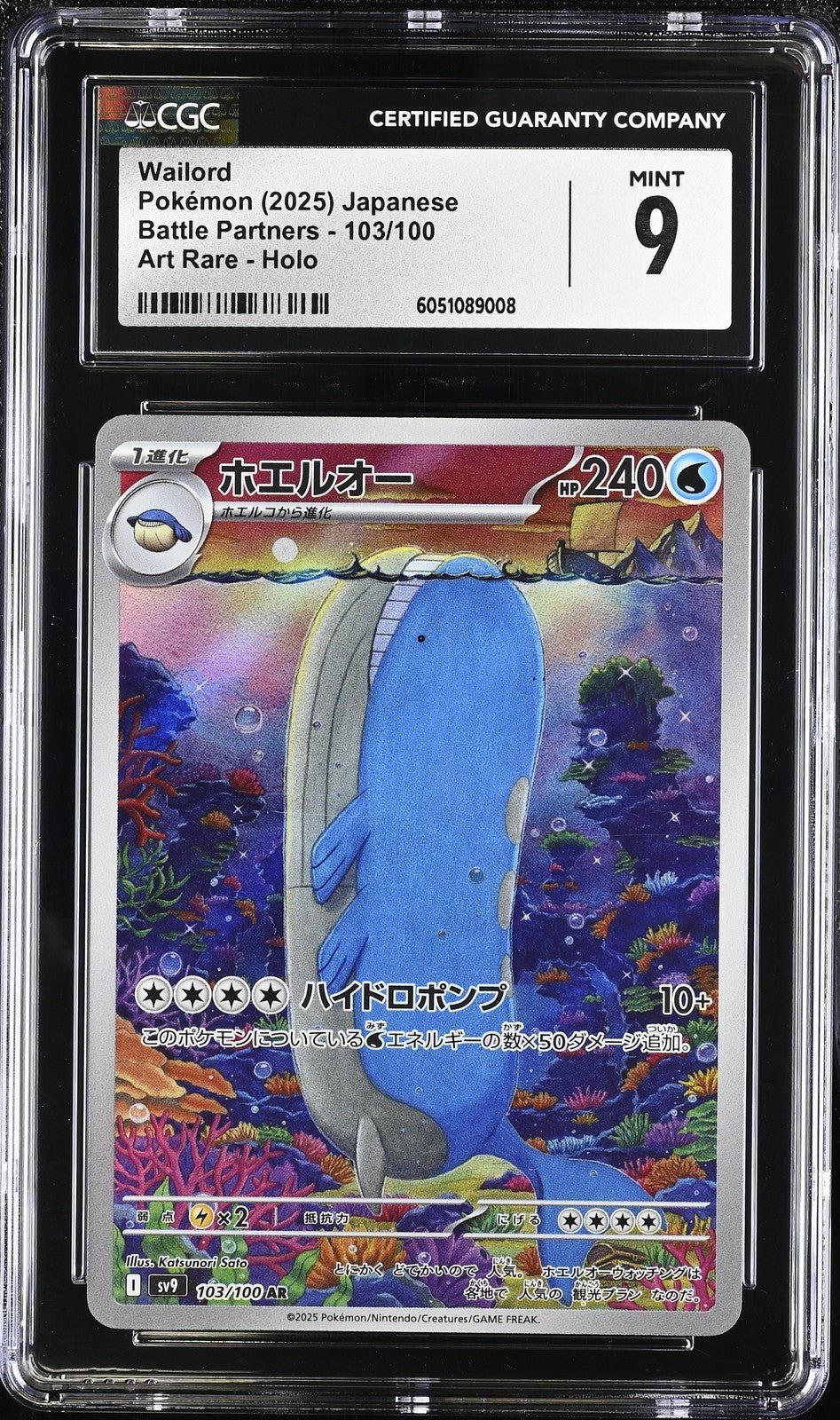 The CGC 9 Wailord 103/100 AR Sv9 Pokemon Battle Partners Holo Japanese card is a highly sought-after collectible for Pokémon TCG enthusiasts. This rare card features a black attribute, belongs to the EX speciality category, and showcases stunning artwork by illustrator 5ban Graphics. With a high HP of 220 and a holographic finish, this card from the Sv9: Battle Partners set is a valuable addition to any collector's deck. Produced by The Pokémon Company, this Japanese-language card is sure to stand out in any collection.