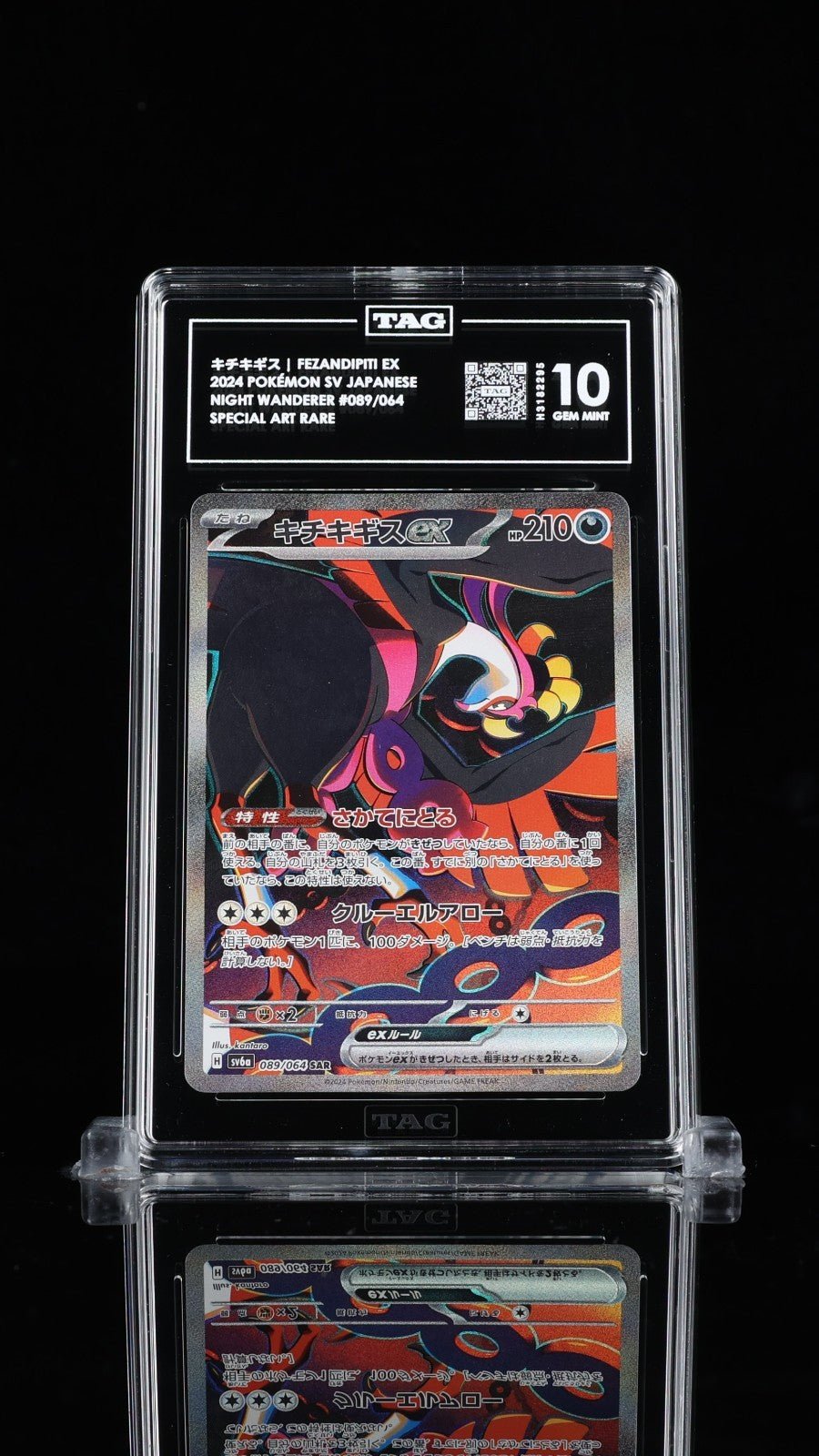The Fezandipiti Ex PSA 10 Japanese Sv6a: Night Wanderer 089/064 Pokemon TCG Holo card is a highly sought-after collectible card from the Pokémon TCG. This Special Art Rare card features the character Fezandipiti with 210 HP, making it a valuable addition to any collector's deck. Manufactured by The Pokémon Company, this Japanese-sized card with a Holo finish is a must-have for fans of the Pokémon trading card game.