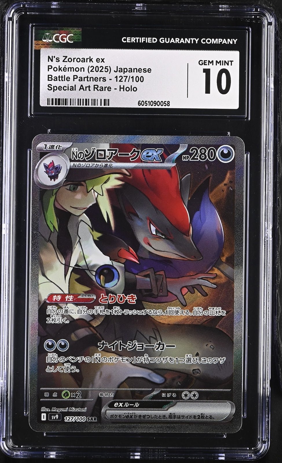 The product is a Japanese Pokémon TCG card featuring N's Zoroark ex from the Battle Partners set. This Special Art Rare card has a dark attribute, 280 HP, and is Stage 1 Pokémon. Manufactured by Nintendo in 2025, the card is made of card stock and has a foil finish. Graded pristine 10 by CGC, this full art alternative art card is a highly sought-after collectible for Pokémon fans and card game enthusiasts alike.