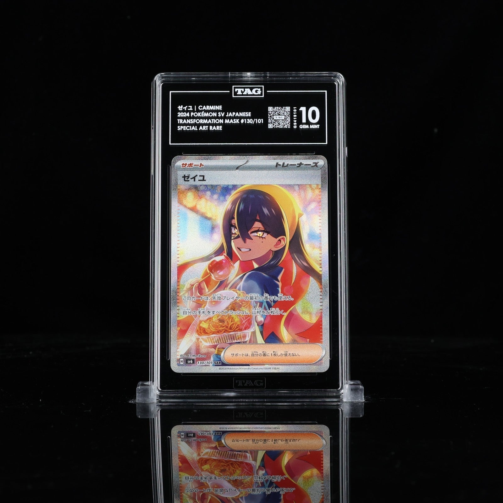 The product is a rare and special art card from the Pokémon Trading Card Game set "Sv6: Transformation Mask", featuring the card name "Carmine" with a holographic finish. This Japanese language card, illustrated by Kantaro and manufactured by The Pokémon Company, belongs to the Trainer card type with a unique card number 130/101. It is a highly sought-after collectible item for fans and collectors of Pokémon cards.Visit our online store to save 7-10% on all cards! (Link in profile banner)