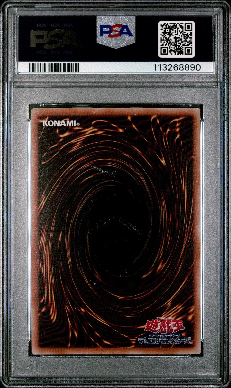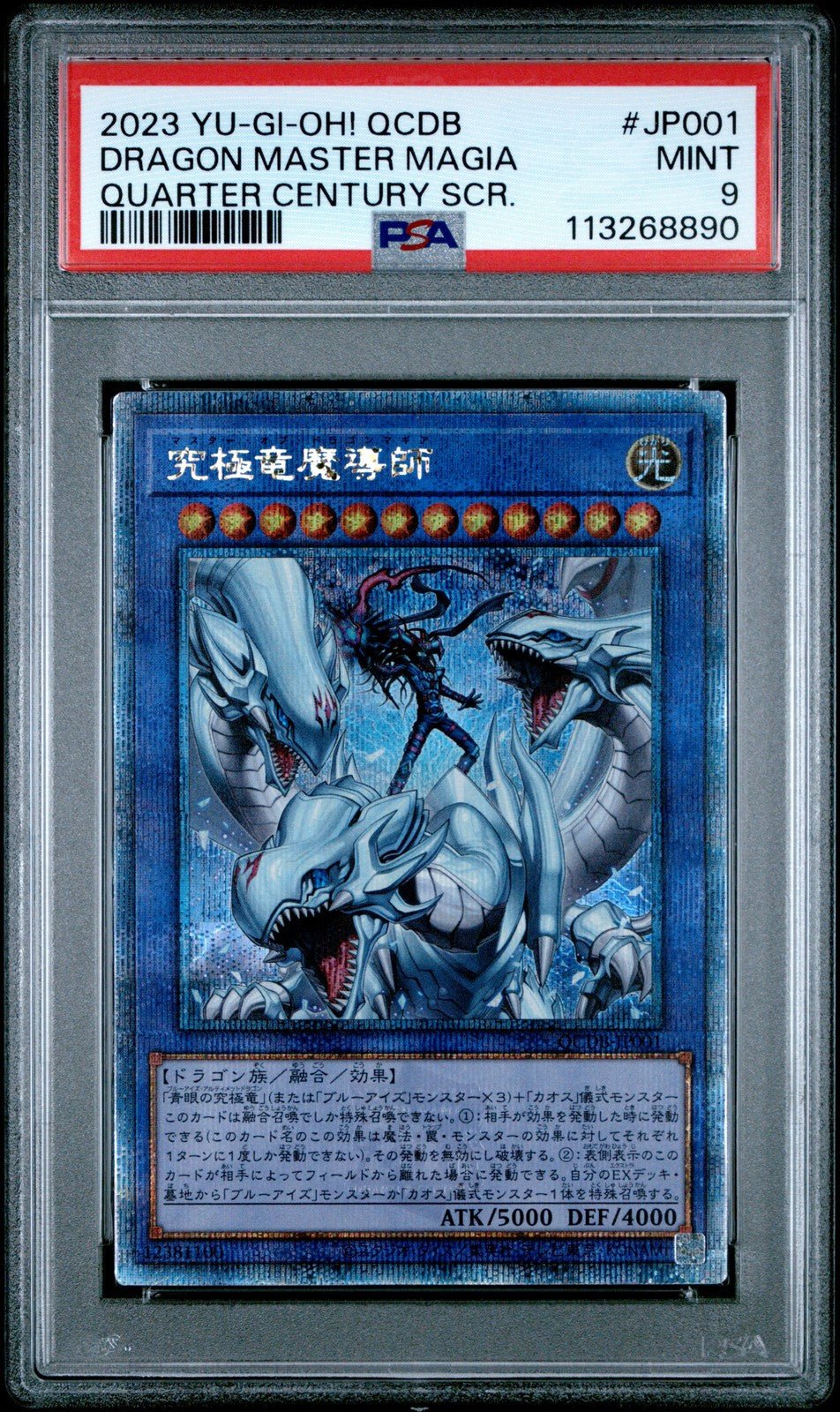 The product is a PSA 9 Yugioh Dragon Master Magia 25th Quarter Century Rare JP001 card from the Masters 25 set. This Japanese-sized card features the Dragon Master Magia character and falls under the categories of Darkness, Colorless, Light, Divine, Black, and Dragon attributes. Manufactured by Konami in Japan, this Secret Rare card is a Quarter Century Speciality with a Holo finish, making it a valuable collectible for Yugioh TCG fans and collectors alike. The 2023 release showcases the iconic Blue-Eyes White Dragon fusion type creature, perfect for fans of the game.