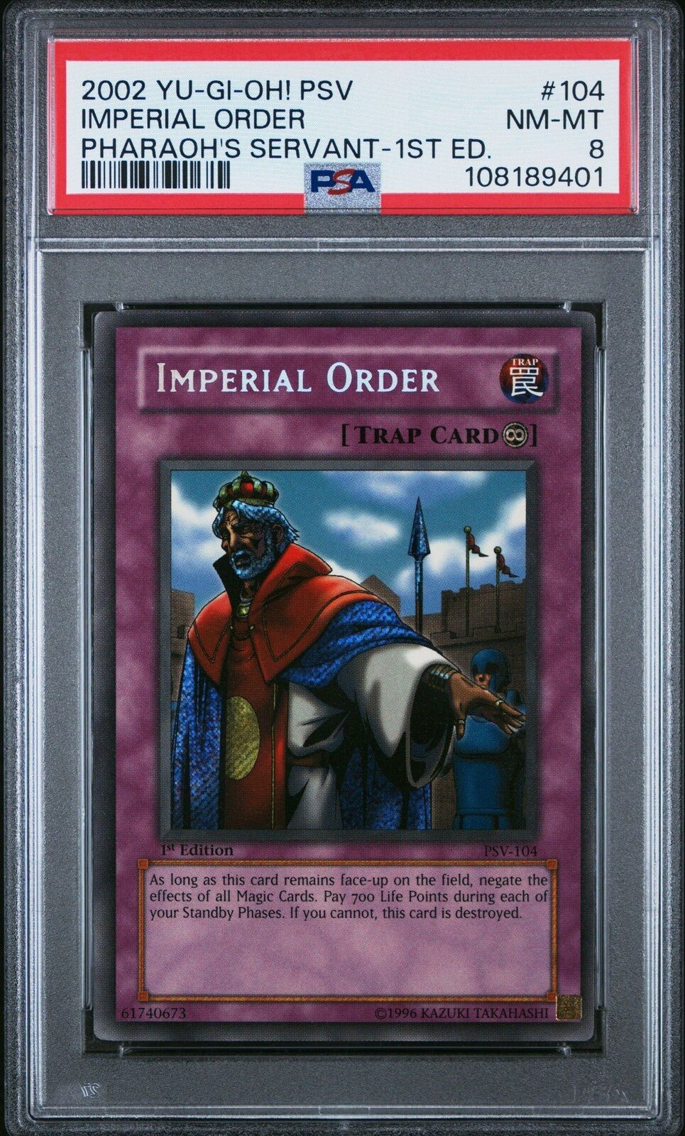 Yugioh 1st Edition Pharaoh's Servant IMPERIAL ORDER PSV-104 Secret Rare PSA 8