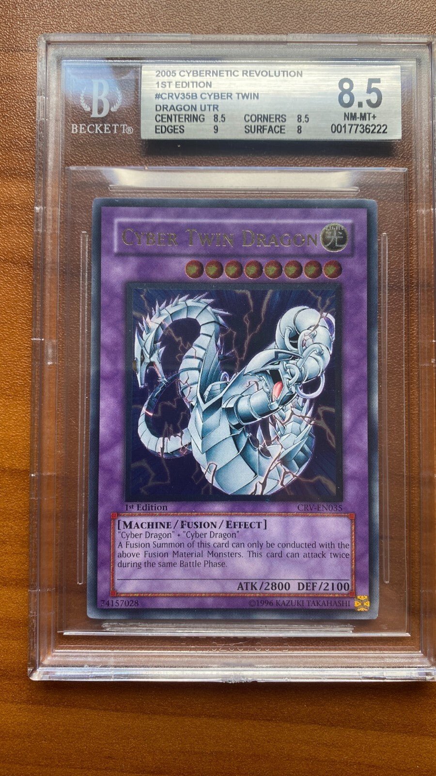 The product is a Yugioh Cyber Twin Dragon CRV-EN035 Ultimate Rare 1st Edition card graded BGS 8.5. This collectible card game (CCG) individual card from the Yu-Gi-Oh! TCG features Cyber Twin Dragon, a powerful fusion monster. The card has been authenticated and graded by Beckett Grading Services (BGS) with a rating of 8.5, indicating a high level of condition and quality. PSA (Professional Sports Authenticator) is also mentioned in the title, suggesting additional authentication or grading from this organization. This card is sought after by collectors and players of the Yu-Gi-Oh! TCG.
