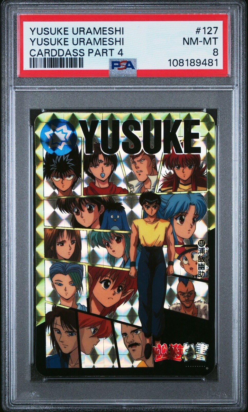 Explore the world of Yuyu Hakusho with this authentic Carddass Part 4 #127 featuring the valiant Yusuke Urameshi team. A must-have for collectors and fans alike, this card captures the essence of the beloved series and is a standout piece from the illustrious Yuyu Hakusho franchise. The Carddass collectible is professionally graded by PSA with an impressive score of 8, ensuring its quality and preservation. It's a tribute to the enduring legacy of the anime and a timeless addition to any collection, promising to be a centerpiece that resonates with nostalgia and appreciation for the genre.